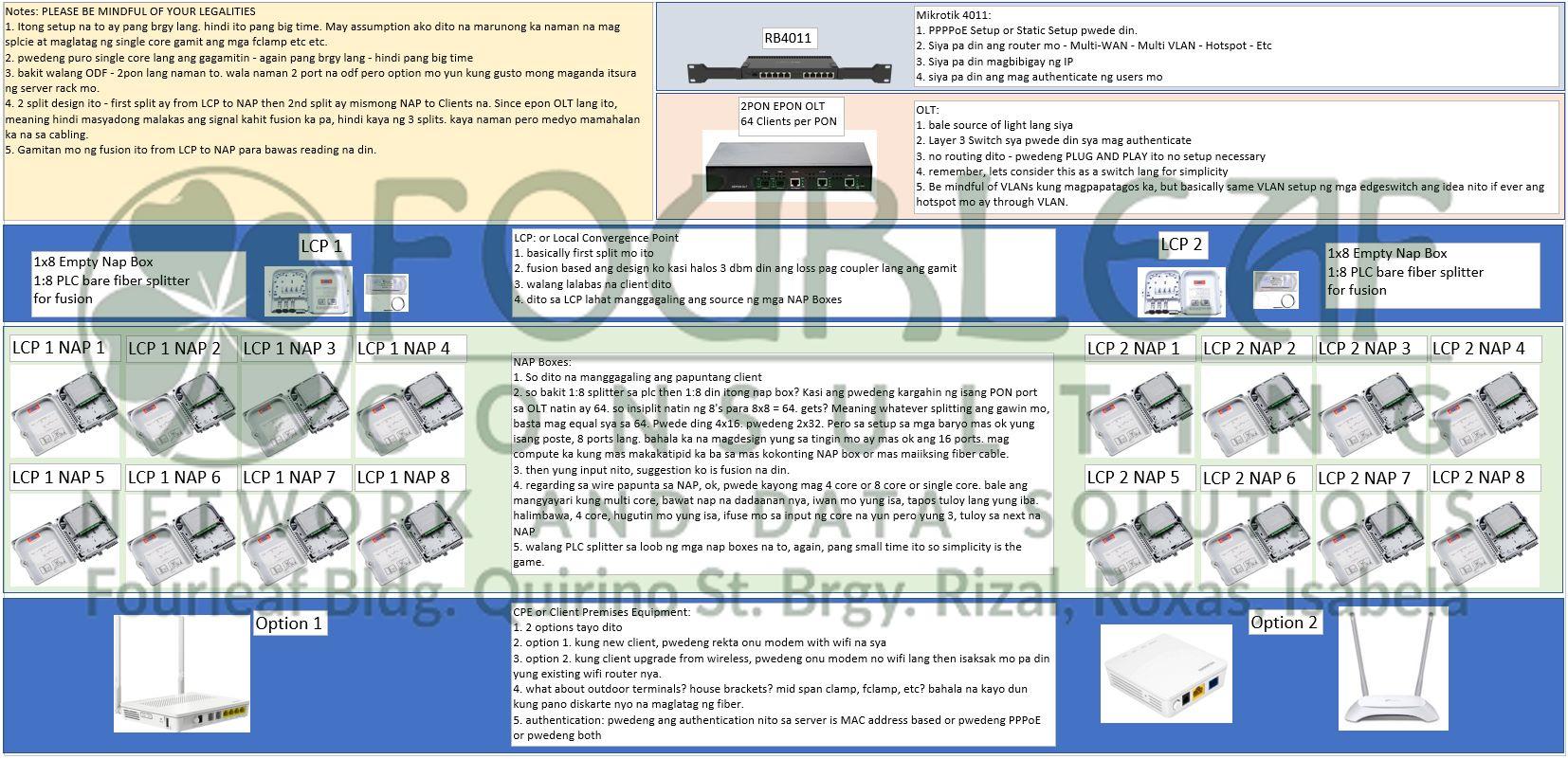 b. so bakit 1:8 splitter sa plc then 1:8 din itong nap box? Kasi ang pwedeng kargahin ng isang PON port sa OLT natin ay 64. so insiplit natin ng 8’s para 8×8 = 64. gets? Meaning whatever splitting ang gawin mo, basta mag equal sya sa 64. Pwede ding 4×16. pwedeng 2×32. Pero sa setup sa mga baryo mas ok yung isang poste, 8 ports lang. bahala ka na magdesign yung sa tingin mo ay mas ok ang 16 ports. mag compute ka kung mas makakatipid ka ba sa mas kokonting NAP box or mas maiiksing fiber cable.